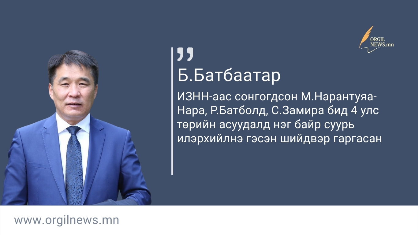 ИЗНН-аас сонгогдсон М.Нарантуяа-Нара, Р.Батболд, С.Замира бид 4 улс төрийн асуудалд нэг байр суурь илэрхийлнэ гэсэн шийдвэр гаргасан