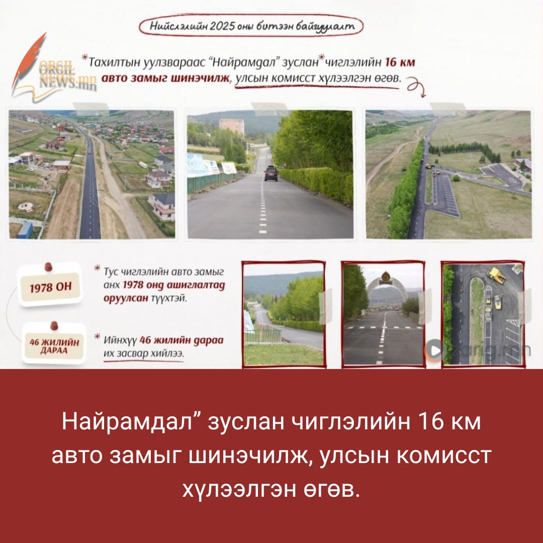 Сонгинохайрхан дүүргийн 22, 34 дүгээр хороо, Тахилтын уулзвараас “Найрамдал” зуслан чиглэлийн 16 км урт, хоёр эгнээ бүхий авто замыг бүрэн шинэчилж, улсын комисст хүлээлгэн өгөөд байна. Тодруулбал, 2024 оны есдүгээр сараас тус авто замыг шинэчилж эхэлсэн бөгөөд өнгөрсөн онд 4 км авто замыг шинэчилсэн юм.
