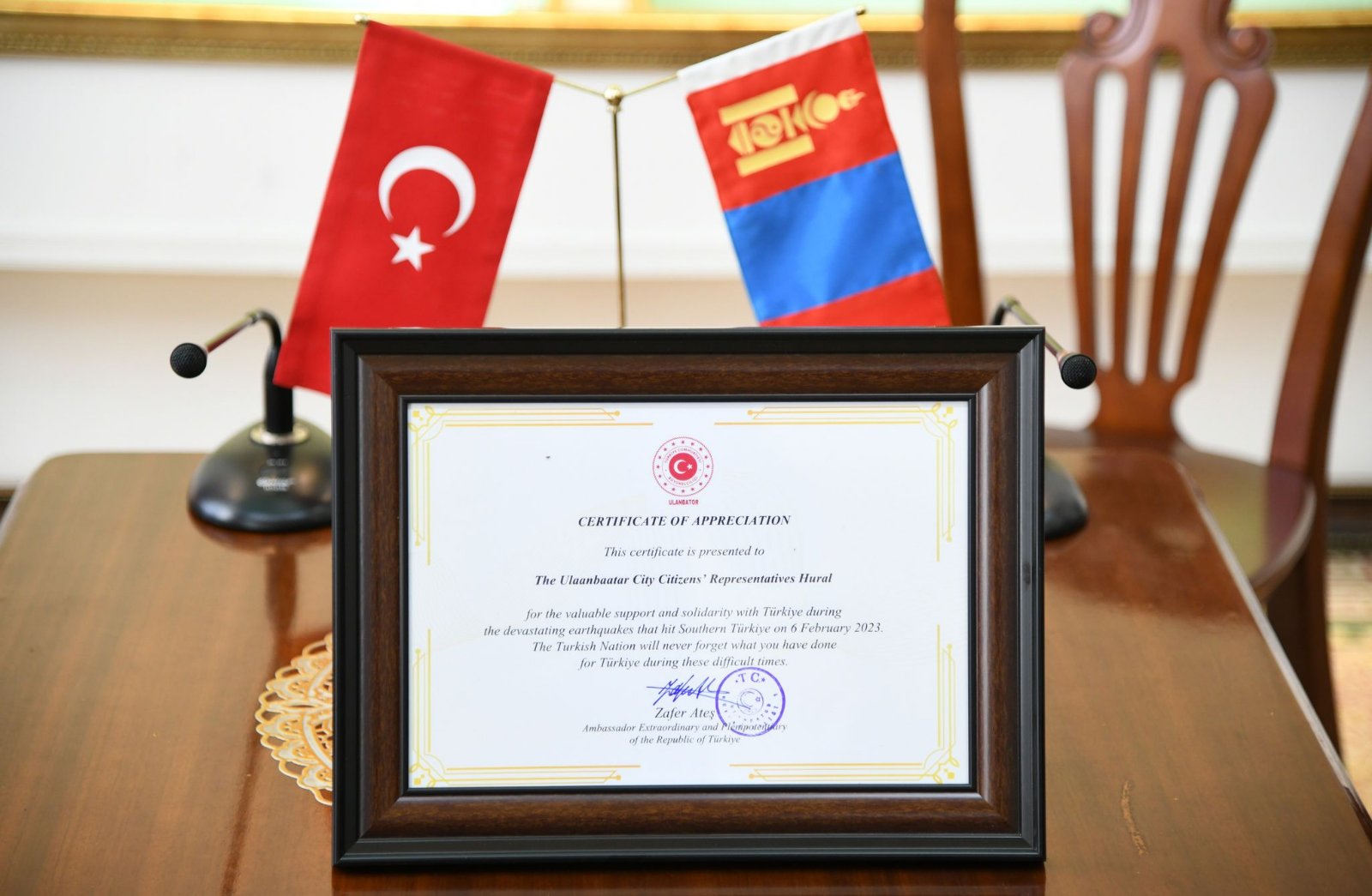 Энэ үеэр Нийслэлийн ИТХ-ын дарга Ж.Батбаясгалан Туркийн ард түмэнд туслах аян одоо ч манай улсад өрнөсөөр буйг онцлоод “...Хоёр орны ард түмэн өнө эртний түүхэн холбоотойгоос гадна одоо ч бүх түвшиндээ найрсаг, дотноор хамтран ажиллаж, харилцдаг. Ард түмнүүдийн энэ харилцаа дипломат харилцааг улам бодит, өргөн болгож байна” гэв. Улмаар Нийслэлийн ИТХ, НЗДТГ бусад төрийн болон төрийн бус байгууллагаас санаачилж, зохион байгуулсан хандивын аянд идэвхтэй оролцож, Туркийн ард түмэнд чин сэтгэлийн тусламжаа өгсөн нийслэлийн иргэд, аж ахуйн нэгжүүдэд мөн талархаж буйгаа илэрхийлсэн юм.Харин Элчин сайд Зафер Атеш “Газар хөдлөлтийн дараа манай улс олон улсын байгууллага болон бусад орны Засгийн газруудад Аврах, эрэн хайх багаа илгээх хүсэлт гаргасан. Бидэнд хамгийн түрүүнд туслахаа илэрхийлсэн орон бол Монгол Улс байсан. Монголчуудын тусламж, хандивыг бид хэрэгцээт газруудад яаралтай хүргэсэн. Монголын дөрвөн зүг, найман зовхисоос манай ЭСЯ-нд хандсан иргэн, аж ахуйн нэгжүүдийн чин сэтгэлийн тусламж, дэмжлэг, захидлыг бид хүлээн авсан бөгөөд зовох цагт монголчууд бидний анд нөхөр юм гэдгийг дахин харлаа…” хэмээн хэллээ.