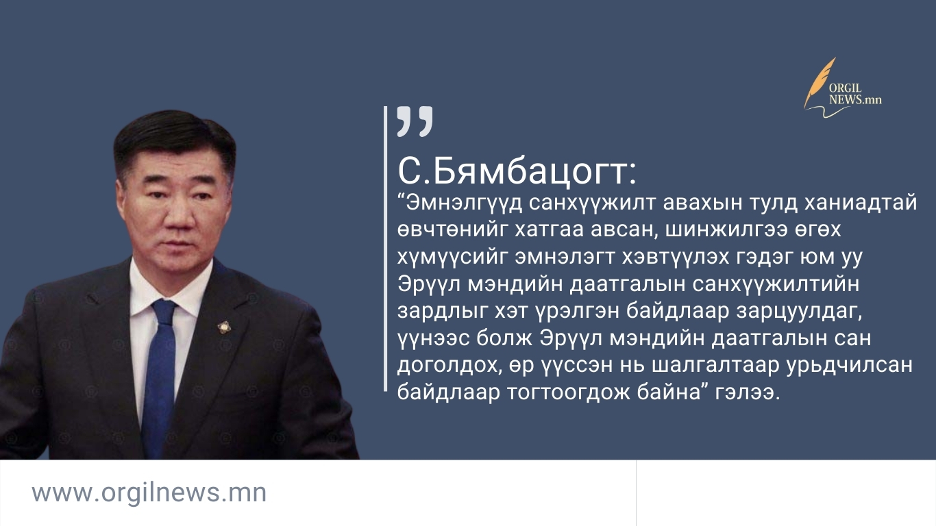 “Эмнэлгүүд санхүүжилт авахын тулд ханиадтай өвчтөнийг хатгаа авсан, шинжилгээ өгөх хүмүүсийг эмнэлэгт хэвтүүлэх гэдэг юм уу Эрүүл мэндийн даатгалын санхүүжилтийн зардлыг хэт үрэлгэн байдлаар зарцуулдаг, үүнээс болж Эрүүл мэндийн даатгалын сан доголдох, өр үүссэн нь шалгалтаар урьдчилсан байдлаар тогтоогдож байна” гэлээ