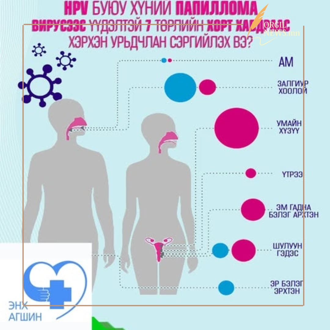 Хүний папиллома вирус эрэгтэй, эмэгтэй хүмүүст зургаан төрлийн хорт хавдар үүсгэдэг. Ихэвчлэн бэлгийн замаар дамждаг энэ вирусийн улмаас жил бүр олон эмэгтэй умайн хүзүүний хорт хавдраар өвдөж байна. Харин эрэгтэйчүүд ам залгиурын, бэлэг эрхтний хавдарт өртсөөр байгаа юм.Иймээс хүний папиллома вирусээс хамгаалах вакциныг 11 настай хүүхдүүдэд товлолын дагуу хийж байна. Ер нь хүнд өвчин үүсгэгч, байгаль дээр байдаг бичил биетүүдийг дөрөв ангилдаг. Вирус, бактери, мөөгөнцөр, шимэгч. Хамгийн жижиг нь вирус юм. Эдгээр бичил биетнүүд хүний биед ороод өсөж үржих байгалийн зохилдлогоотой. Үржихдээ хүний биеийн эд эсүүдийг гэмтээдэг.Үүнийг өвчин үүслээ гэж хэлдэг. Папиллома вирус ихэвчлэн эрэгтэй, эмэгтэй хүний бэлгийн замаар дамжиж, бэлгийн замын эд эсүүдэд халдварлаж, тэндээ өсөж үрждэг. Энэ явцдаа ялангуяа эмэгтэй хүний умайн хүзүүнд дийлэнх нь, зарим тохиолдолд эрэгтэй хүний шээс бэлгийн замын эсүүдийг олон жилийн турш хувирган өөрчилдөг.Вакцины судалгааг өндөр хөгжсөн орнууд хийж, бүтээгдэхүүнээ гаргасан. Үйлдвэрийн хүчин чадалтай, өндөр хөгжилтэй орнууд гэсэн үг юм. Эдгээр орон вакцины найрлага, хэлбэр, ямар өртөгтэй байхыг тогтоосон. Ингэснээр зарим хөгжсөн орон өндөр үр дүнд хүрчихлээ.Эрт илрүүлэг, оношилгоо, эмчилгээ гээд бүх юм нь бүрэн шийдэгдчихсэн өвчин бол умайн хүзүүний хорт хавдар. Энэ хавдар үүсэх олон эрсдэл бий. Үүний хамгийн чухал буюу үндсэн шалтгаан нь хүний папиллома вирус юм. Энэ вирус бэлгийн замаар, арьс салстаар дамжиж халддаг.Халдварын бараг 90 гаруй хувь нь умайн хүзүүний хорт хавдар үүсгэдэг. Эмэгтэй хүнд энэ вирусээс улбаатай умайн хүзүүний хавдар үүсэх эрсдэл нэмэгддэг. Мөн эмэгтэйчүүдийн үтрээ, гадна бэлэг эрхтэн буюу бэлгийн их, бага уруул, хэлүү болон эрэгтэй, эмэгтэй хүйсэд адилхан ам залгиурын (хэлний арын уг, тагнай, гүйлсэн булчирхай) эрэгтэй, эмэгтэй хүнд хоёуланд нь шулуун гэдэсний хавдар үүсгэх эрсдэлтэй.Хүний папиллома вирусээс хамгаалах вакциныг олон жилийн судалгааны үр дүнд гаргаж авсан, туршилт, судалгаанууд бүрэн хийгдсэн. Үүний үндсэн дээр хүнд хэрэглэхэд боломжтой юм байна гэж үнэлэн, вакциныг хэрэглэдэг. Вакциныг тухайн вирусийн капситын уургаас гаргаж авсан. Вирусийн геном агуулаагүй вакцин гэсэн үг юм. Вакцины найрлагад үндсэн болон нэмэлт бодисууд байдаг юм.Эдгээр нь маш бага хэмжээтэй учраас энэ нь хоргүй. Тиймээс дэлхийн ихэнх оронд энэ вакциныг хэрэглэж байна. Гаж нөлөө байхгүй, эрсдэл хамгийн бага. Иймд манай улс ч энэхүү вакциныг 2024 оны 11 дүгээр сараас эхлэн 11-15 настай хүүхдүүдэд хийж байна. Мөн Ээж аавууд, эмээ өвөө нар, багш нар хүүхдүүдээ дархлаажуулалтад нь хамруулаарай гэж зөвлөе.